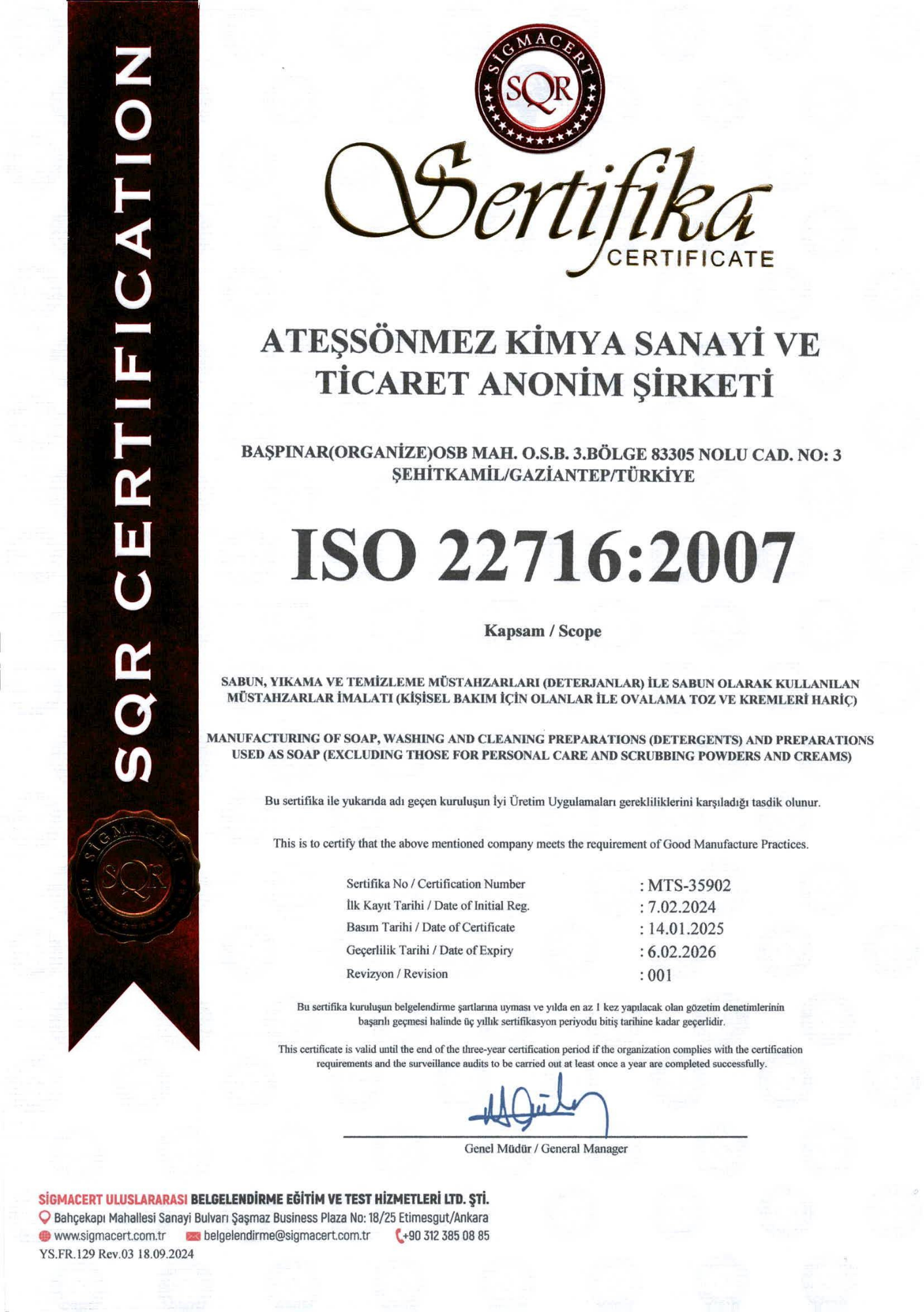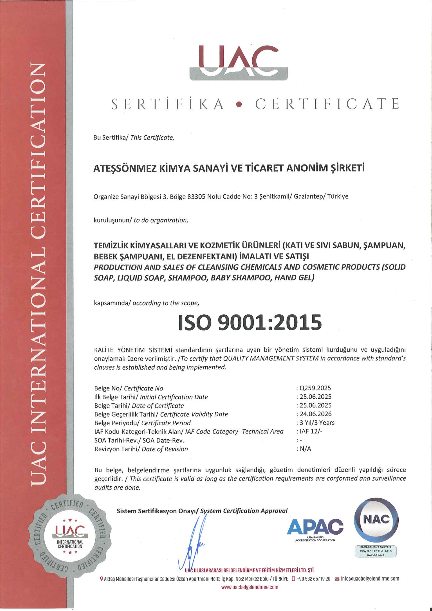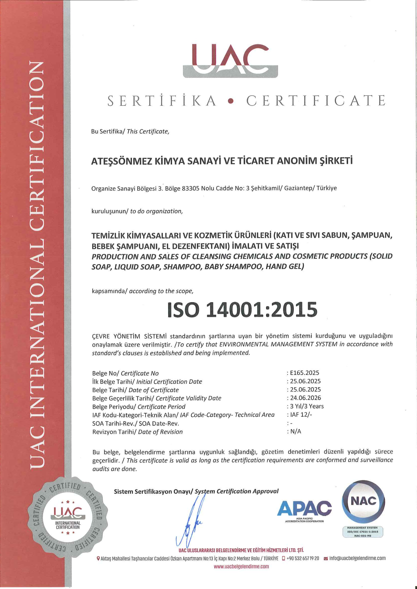 Ateşsönmez Kimya, kalite ve çevre yönetiminde uluslararası standartlara uygun üretim anlayışıyla ISO sertifikalarını başarıyla uygulamaktadır.